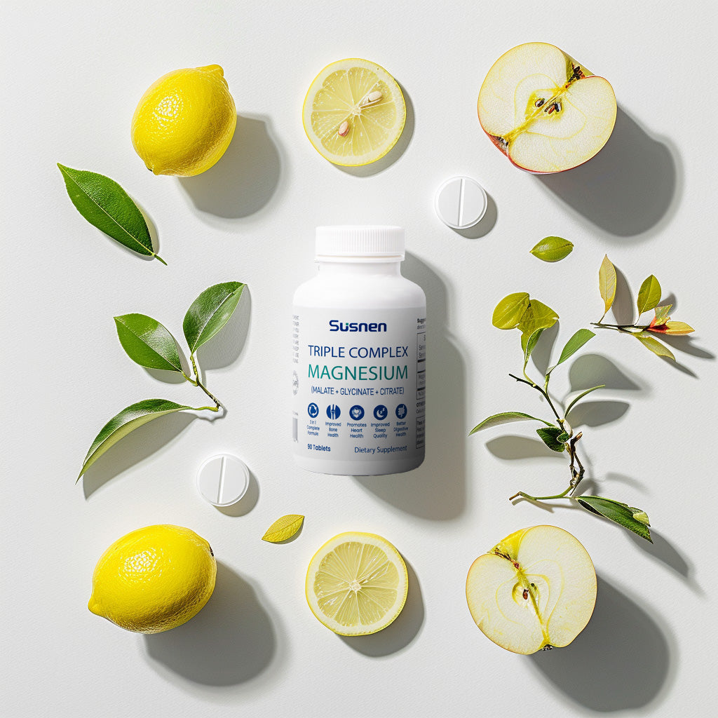 Introducing Susnen Triple Complex Magnesium, a powerful blend of magnesium citrate, magnesium malate, and magnesium glycinate. This comprehensive magnesium supplement is designed to support bone health, heart health, and nervous system function. Whether you're looking to improve sleep quality or enhance your overall well-being, our Triple Complex Magnesium tablets provide the essential minerals your body needs.